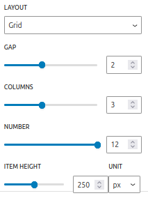 • Grille : La plus claire, les éléments sont disposés en fonction des réglages : espacement, nombre de colonnes