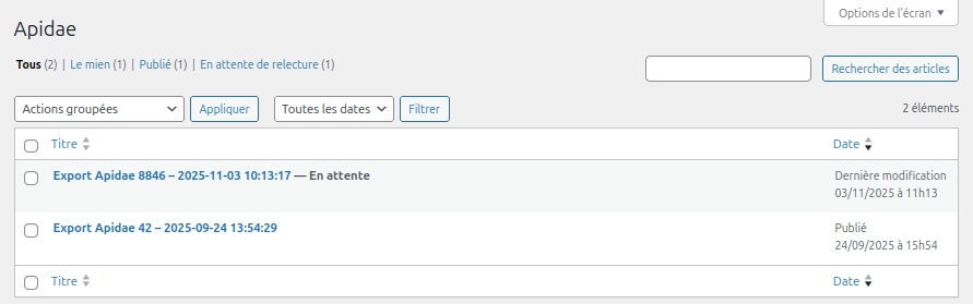 Si l’URL de notification est bien paramétré, cet export apparaitra également dans la section Apidae de votre tableau de bord WordPress, avec le statut En attente.