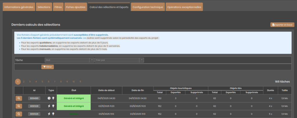 Lors de votre premier paramétrage, pour éviter d’avoir à attendre le lendemain que l’export soit généré, vous pouvez demander à Apidae d’effectuer un export manuel. Attention, cette opération est restreinte, vous ne pouvez pas demander plus de 2 exports manuels par jour.