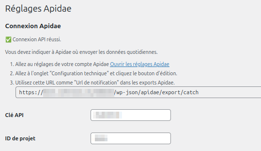Pour cela, vous devez saisir votre clé API ainsi que l’ID de projet Apidae