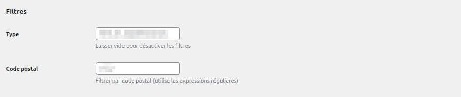 Les communes peuvent être filtrées par code postal. Ce champ support les expressions régulières. Par exemple, saisissez /^31/ pour n’afficher que les communes de Haute-Garonne.