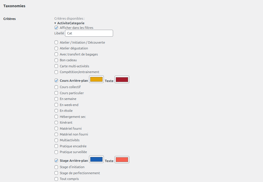Ce bloc permet de colorer un élément en fonction de la taxonomie de l’élément et de la couleur attribuée dans les réglages.