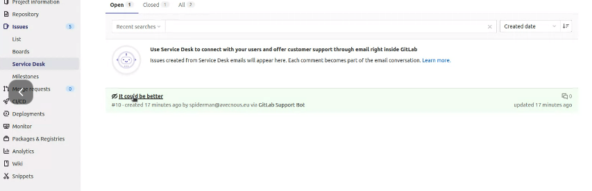 Les tickets d’assistance sont associés à des problèmes dans Gitlab. Les problèmes peuvent être créés de deux manières : Problème standard ou Service Desk.