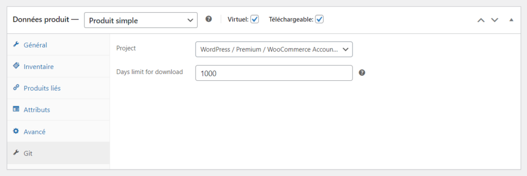 Créer ou modifier un produit : si votre produit est « virtuel » et « téléchargeable », vous verrez apparaître un nouveau menu « Git ».