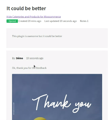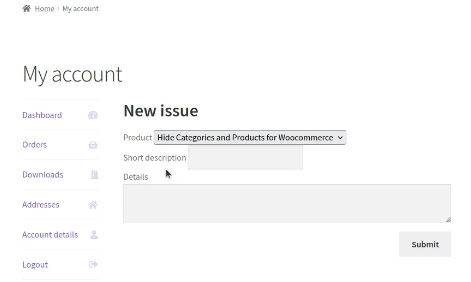 Enfin, vos clients ont la possibilité de créer un ticket d’assistance (Help Desk) depuis la page produit ou leur compte client dans WooCommerce, qui apparaîtra directement dans votre projet Gitlab.