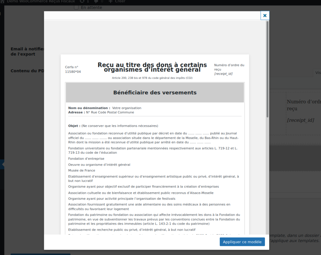 This is the content used to generate the one-time tax receipt. It can be composed of variables that are replaced depending on the user for whom it is generated: