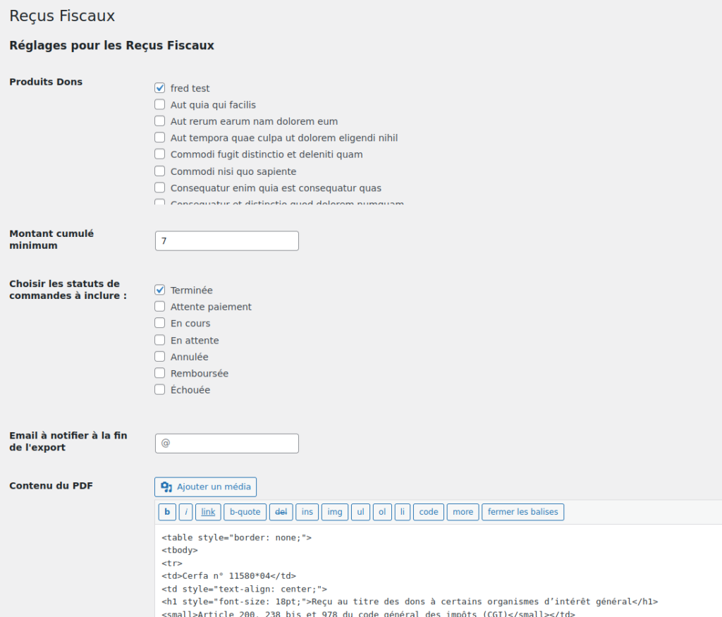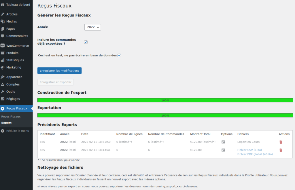 With this plugin you can generate tax receipts in PDF and CSV, in bulk or per user/order.